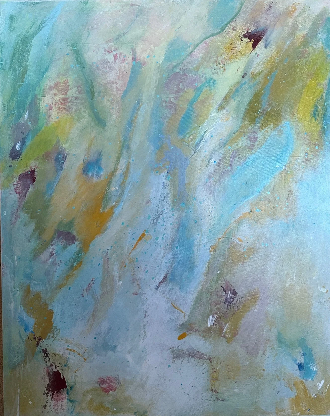 Whispers- $990 framed in white wood frame 24x30 - Currently showing at Desert Art Center in Palm Springs. Fluid strokes and gentle blends recall sunlight dancing across a shallow streambed — the interplay of movement and stillness in nature’s quiet rhythms. The painting carries a current of energy, but its surface remains serene. Every mark feels like a ripple, fleeting yet eternal.